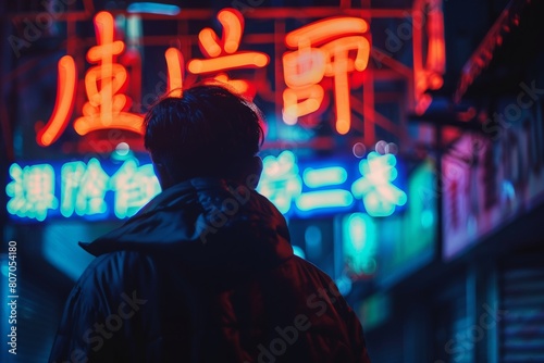 Moody portrait of a man from behind, walking under the neon lights of an Asian city at night, reflecting the vibrant urban life and culture with colorful signage.