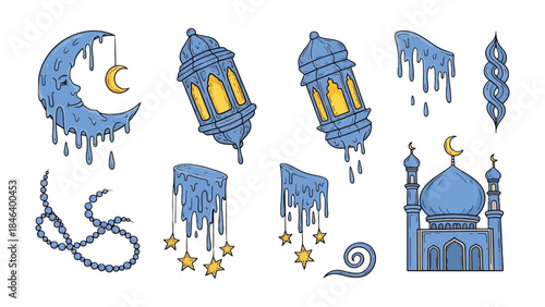 Moon and Lanterns: A collection of stylized illustrations featuring a crescent moon with a smiling face, intricate lanterns, and a majestic mosque, evoking a sense of tranquility.