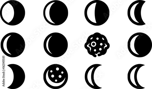 moon, icon, set, phase, symbol, crescent, glyphs, lunar, black, stock, vector, illustration, light bulb, graphic, idea, silhouette, electricity, power, star, electric, energy, bulb, business, light, line, arabia, arrow, association, belief, believe, brainstorm, buttons, carpet