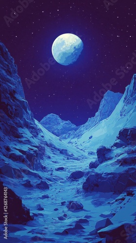 moon, mountain, snow, landscape, night, star, blue, dark, vale, sky, cosmic, celestial, space, winter, cold, rock, terrain, desolate, glacé, peaceful, serene, quiet, huge, endless, illuminated, glowing, crater, surface, perspective, astronomy, vista, scene, background, depth, vertical, fantasy, digital, art, illustration, texture, rugged, altitude, nature, environment, light, aethereal