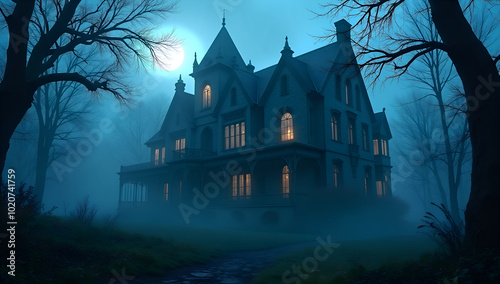 haunted, house, full moon, darkness, eerie, gothic, mystery, shadow, skittish, ghostly, architecture, tree, forest, mist, creepy, lantern, victorian, night, path, chilling, silhouette, fog, luxury home, gable, porch, sinister, twilight, atmosphere, legend, horror, supernatural, whisper, flickering, abandoned, secluded, chill, ominous, spectral, aura