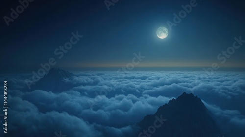 moon, mountain, cloud, night, sky, full moon, landscape, nature, scenery, aerial view, above the clouds, serene, peaceful, tranquil, majestic, dark, blue, mountain peak, moonlight, illuminated, shadow, silhouette, atmosphere, dramatic, beautiful, vista, viewpoint, high altitude, elevation, wonder, enigmatic, fantasy, dreamlike, cosmic, celestial, night sky, mountain chain, digital artwork, wallpaper, background