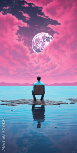 man, water, full moon, surreal, night sky, dreamy, alone, solitude, fantasy, horizon, seated, tranquil, landscape, serene, artistic, digital artwork, peaceful, aethereal