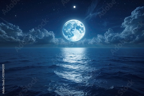 Moonlit Sky Over a Blue Ocean with Stars and Clouds in the Dark Night Space
