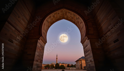 moon, archway, evening, twilight, sky, mosque, architecture, crescent, night, outdoors, landscape, scenery, tranquil, peaceful, illuminated, historic, city, urban, religious, dramatic, sunset, nature, bright, full moon, shadow, stillness, evening light, spirituality, serene, cultural, landmark, historical, building, dusk, night time, beautiful, traditional, moonrise, atmospheric, evening sky, calmness, ambience, iconic, celestial, viewfinder, city landscape, atmosphere