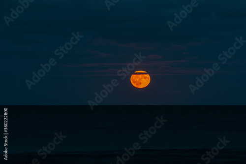 Moonrise on the Baltic Sea. Moon over the water surface with a dark blue sky. Yellow colored moon on the horizon with smooth water surface and few clouds