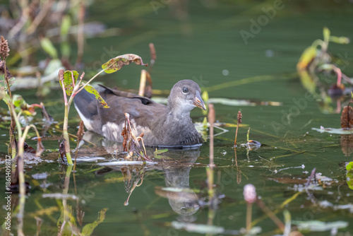 water, chick, baby, juvenile, duck pond, lake, closeup, britain, scotland, side, blurred background, copy space, britain, britain