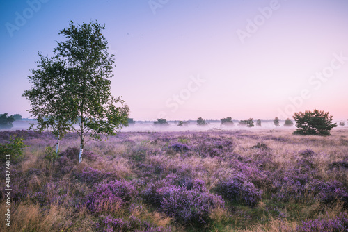 tree, landscape, sky, nature, field, sunset, grass, meadow, sunrise, morning, purple, tree, summer, mist, blue, cloud, heather, green, forest, silhouette, autumn, horizon, view, fog, cloud