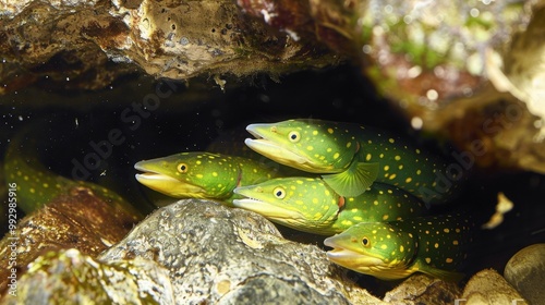 moray, eel, cave, rocky, crevice, tank, green, snowflake, slither, water, aquatic, habitat, exhibit, marin, nocturnal, predatory, camouflage, underwater, aquarium, marine life, carnivorous, reef, hideaway, predator, environment, fish, observation, enclosure, display, exploration, stealth