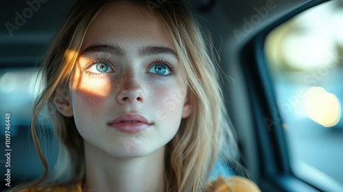 Morning Coffee Routine. Young woman looking through car window with sunlight on face, natural portrait for lifestyle, travel, beauty campaigns, emotional mood, soft focus, warm colors, urban backgrou