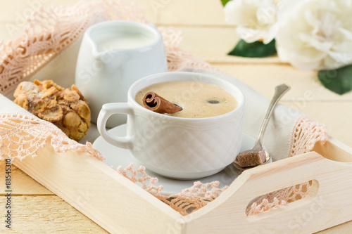 beige, black, breakfast, brown, cinnamon, closeup, hot drink, cookie, cup, dessert, drink, energy, espresso, flower, food, freshness, frothy, epicure, heat, hot, leisure, liquid, material, milk, morning, napkin, object, product, refreshment, saucer, snack, spice, spoon, sugar, sweet, table, temperature, tray, white, wood