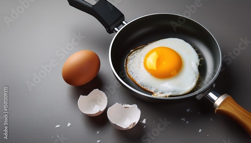 fried egg, egg, pan, frying pan, single, yolk, white, cooked, breakfast, food, cooking, kitchen, culinary, delicious, simple, alimentary, protein, meal, ready to eat, hot, fresh, homemade, frying pan, non-stick, small, compact, eggshell, broken, grey background, preparation, healthy, ingredient, culinary arts