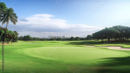 Morning Glory on the Golf Course Scenic View of Lush Green Fairway, Bunker, and Trees