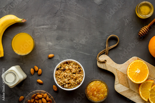 Morning granola near toast and oranges on grey background top-down frame copy space