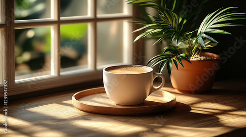 Morning Light Dances on a Minimalist Coffee Cup Beside a Lively Plant on a Wooden Table