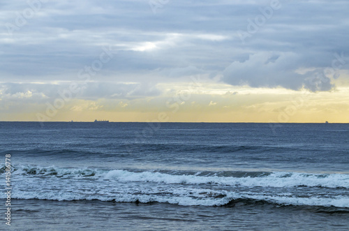 sky, ocean, beach, morning, early, sun, shore, cloudy, wave, water, overcast, sunlight, sand, coast, seascape, dramatic, sea, swell, beautiful, white, scenic, nature, horizon, dawn, colours, landscape, ship