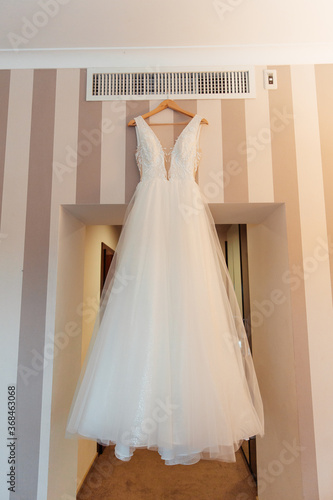 Morning of the bride in a pink robe and a veil in the hotel on the bed, wedding dress