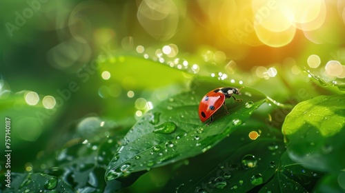 coccinellidae, dew drops, green leaf, sunlight, macro, freshness, nature, insect, morning, vibrant, bokeh, bright, natural, spring, new life, eco, garden, ecology, summer, sunbeam, leaf, wet, closeup, wildlife, outdoors, environmental, growth, tiny, gardening, water droplets, sunshine, radiant, lush, serene, beauty, peaceful, springtime, healthy, environment, natural world, delicate, sustainable, pure, clarity, fauna, generative, ai
