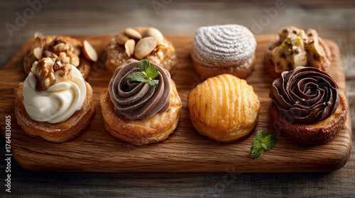 Moroccan pastries presented on Scandinavian oak cutting board, airy background