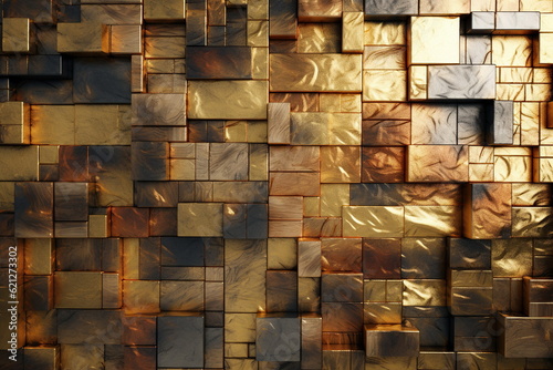 Mosaic background, gold and copper cubes pattern, modern shiny metal blocks, tiled wall backdrop. Created with generative Ai