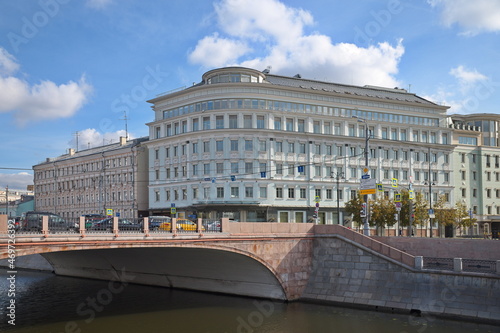 Moscow, Russia - September 29, 2021: Autumn view of the Maly Moskvoretsky Bridge and the administrative and office building on Kadashevskaya Embankment