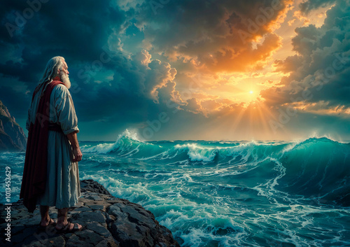 mose, sunset, biblical, spiritual, old testament, faith, sea, water, cloud, miracle, exodus, leadership, religion, hebrew, freedom, deliverance, nature, divine, god, israel, prophet