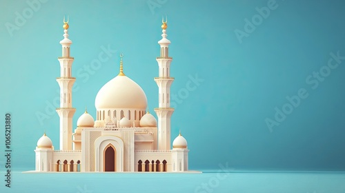 Mosque architecture in UAE with traditional dome and minarets, on a clear blue background with space for text.
