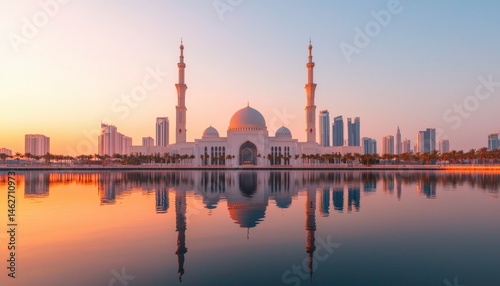 mosque, sunrise, water, architecture, islam, city landscape, dubai, morning, beauty, travel, vacation, landmark, serene, calm, peaceful, gold, light, horizon, building, dome, minaret, city, holiday maker, stunning, amazing, beautiful, elegant, grand, exterior, religion, arabic, desert