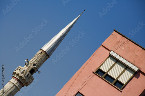 mosque, islam, urban scene, architecture, alanya, minaret, building exterior, window, spirituality, clear sky, cable, turkey, religion, shutter, speaker