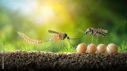 Mosquitoes Laying Eggs Near Larvae on Soil with Green Background
