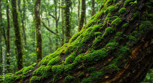 Moss covered tree trunk in lush forest