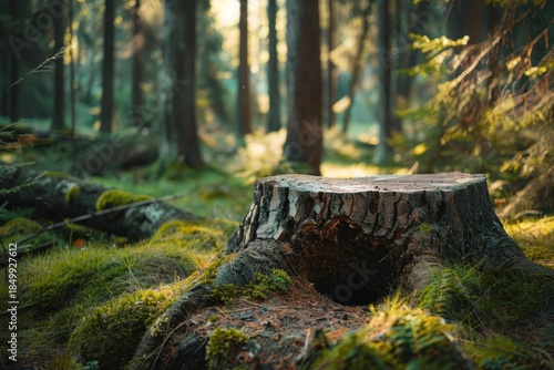 Moss growing on a tree stump in a forest clearing with sunlight illuminating the scene