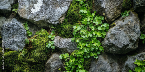 Moss-covered stone background with green lush vegetation growing over ancient gray rocks.