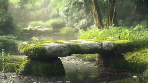 Moss-covered stone bench in peaceful natural landscape. Archaic. Illustration