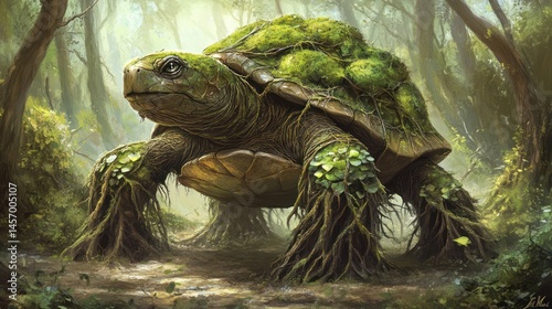 tortoise, turtle, moss, forest, tree, wood, nature, wildlife, animal, creature, shell, green, leaf, plant, walking, habitat, outdoors, environment, illustration, artwork, fantasy, giant, massive, ancient, earth, sunlight, path, adventure, journey, ecosystem, detail, closeup, ground, art, design, digital, beautiful, vibrant, alive, healthy, majestic, strength, powerful, slow, steady, realistic, creation, earth