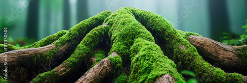 Moss-covered tree roots in a serene forest, showcasing lush greenery and nature's beauty.