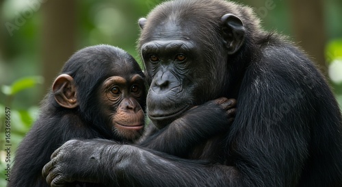 Mother and Baby Chimpanzees Embracing in Lush Green Forest, Nature Photography, Emotional Bonding