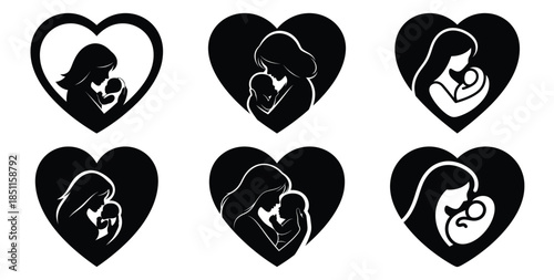 mother and baby silhouette inside vector art icon set. Black color and white background