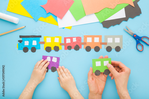 Mother and child hands creating beautiful colorful paper train with wagons on light blue table background. Pastel color. Point of view shot. Closeup. Playing and spending time together. Top down view.