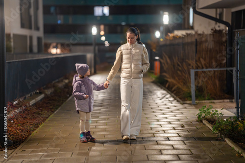 Mother and child walking hand in hand through wet street at night. Rainy parenting scene.