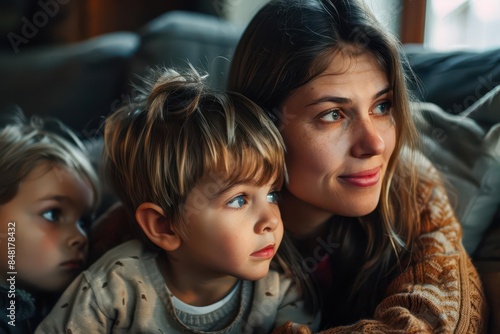 mother and children attentively looking at something together family bonding