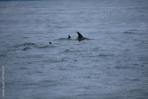 Mother and children white-nosed dolphins in the Atlantic ocean off the coast of Husavik in Iceland