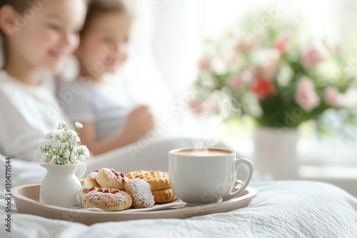 breakfast, bed, hot drink, pastry, mother, daughter, female, caucasian, children, adult, flower, cosy, warmth, bonding, morning, steaming, cup, tray, relaxation, comfort, family, love, motherhood, togetherness, home, happiness, serene, peaceful, indoor, soft, casual attire, white, smiling, affection, sweet, dessert, rose, blurred, background, leisure, human relationships, nurturing, weekend, calm