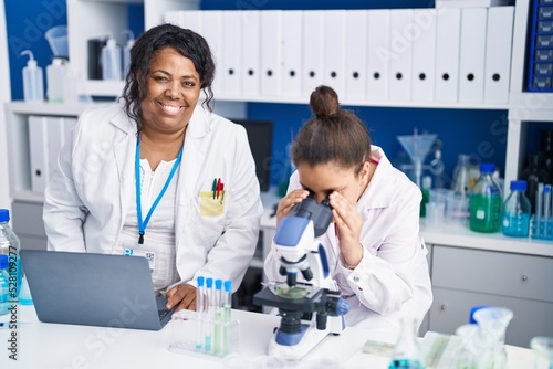 Mother and daughter scientists using microscope and laptop working at laboratory