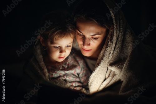 Mother and Daughter Share Cozy Reading Moment Under Blanket in Dim Light, Creating Bonding Experience, Showing Family Love