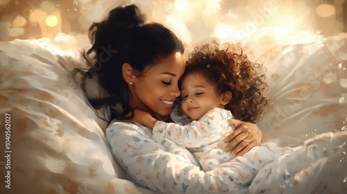 mother, daughter, love, family, bed, sleeping, happy, home, togetherness, tenderness, childhood, innocence, parenting, motherhood, care, comfort, bonding, human relationships, peace, serenity, relaxation, bedtime, cosy, warmth, intimacy, affection, happiness, joy, smile, hugs, hug, connection, trust, security, portrait, lifestyle, indoor, daytime, natural light, golden hour, soft focus, african american, ethnicity, curly hair, pajama