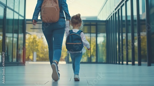 woman, daughter, girl, mother, children, walking, backpack, backpack, shoe, sneaker, jean, denim, building, glasses, window, floor, tile, pavement, urban, city, street, day, sunny, bright, light, backview, rear, perspective, casual attire, family, together, childhood, innocence, love, togetherness, eltern, bond