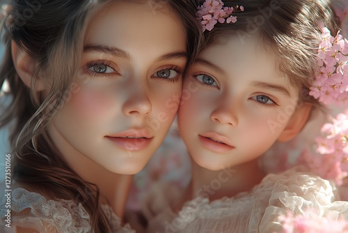 Mother and Daughter with Long Hair and Pink Flowers Embracing in Sunlight