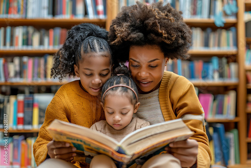 Mother and daughters reading together. A beautiful image depicting family bonding and education. Perfect for educational materials, family-focused content, and literacy campaigns.