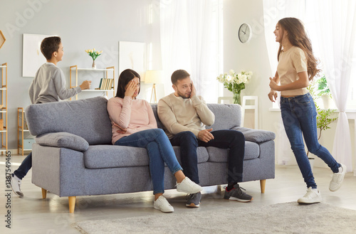 Mother and father sitting on sofa and being tired of their naughty children who are running around and making noise, spending time together at home. Children upbringing and family concept